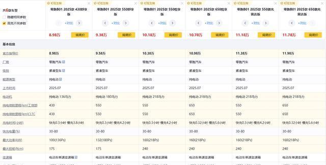 一些人担心续航焦虑,一般不会选择纯电A级车,所以同级卖得不错的通常是可油可电的插混或增程汽车,而零跑B01的续航却是看齐中型车——Model 3的,该车提供430km、550km、650km三种续航版本可选,尤其是顶配车型搭载宁德时代提供的67.1度大电池,而售价达23.55万的Model 3 2025款 改款 后轮驱动版虽然用的也是宁德时代电池,但容量仅62.5度,CLTC纯电续航仅634km。另外零跑B01全系支持快/慢充,而Model 3仅配备快充接口,万一有时候开到充电设施不完善的郊外,可能会发生因不兼容而充不上电的情况。