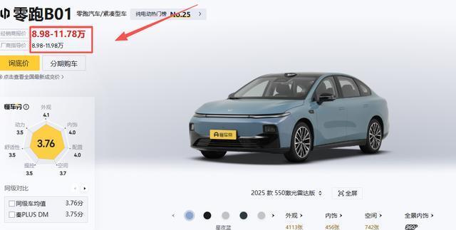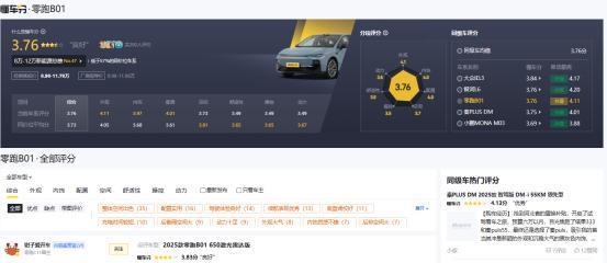 在“七边形综合评分”中,零跑B01的总体得分是3.76分,高于同价位汽车3.73的平均分,并且外观、内饰、配置等3项得分在4分及以上,可见其亮点所在。在老车主评价中,“整体空间出色”、“配置实用”、“驾驶体验良好”等等,是零跑B01的主要关键词,另外还有个别车主对该车的底盘、快充、动力也表示比较满意。