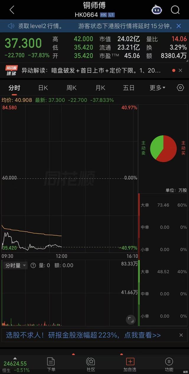 北京商报讯(记者 程靓)3月31日,国内“铜质文创第一股”杭州铜师傅文创(集团)股份有限公司(以下简称“铜师傅”)正式在香港联合交易所主板挂牌上市。然而,其上市首日开盘即破发,铜师傅每股定价60港元,上市首日开盘报35.42港元,较发行价低开40.97%。截至发稿前,铜师傅股价报37.3港元/股,跌幅37.83%。